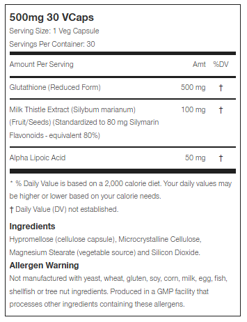 Glutathione (500mg) with Milk Thistle & Alpha Lipoic Acid - 30 Veg Capsules